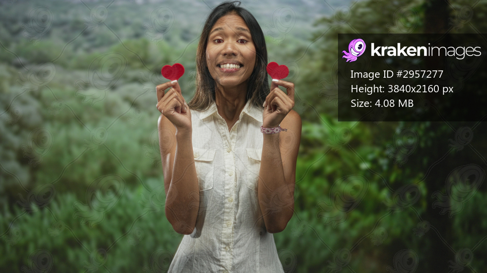 Young thai brunette woman holds two small red felt hearts with both hands near her face in a forest setting, neutral to pensive expression; melancholy love. - Kraken Images