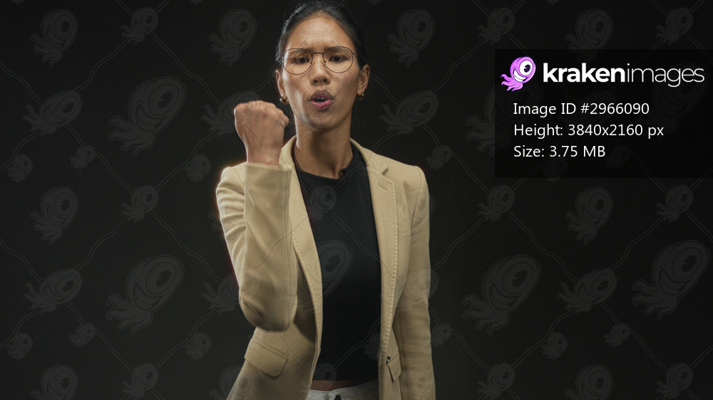 Young thai woman clenches fist in studio wearing beige blazer, black shirt and glasses; defiance resolve.