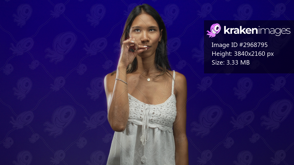 Young thai woman finger to lips then waves hand, wearing white crochet dress in studio; playful curiosity.