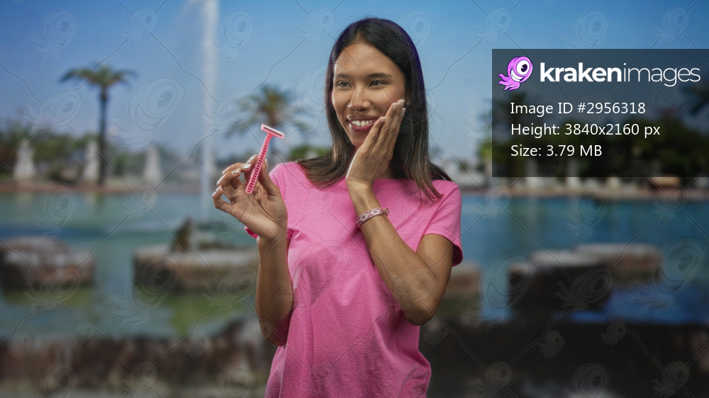 Young thai woman holding a pink razor and covering her mouth with her hand at a public fountain park, mid gesture of surprise; surprise grooming.