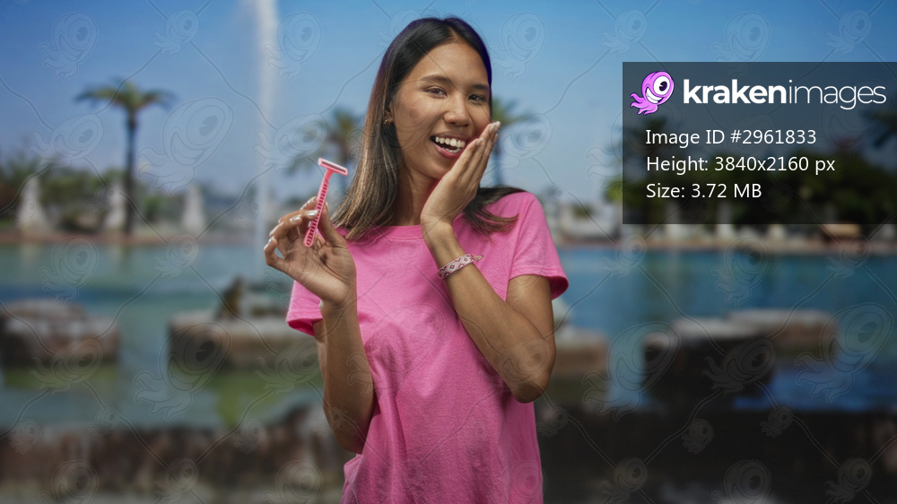 Young thai woman holding a pink razor and covering her mouth with her hand at a public fountain park, mid gesture of surprise; surprise grooming.