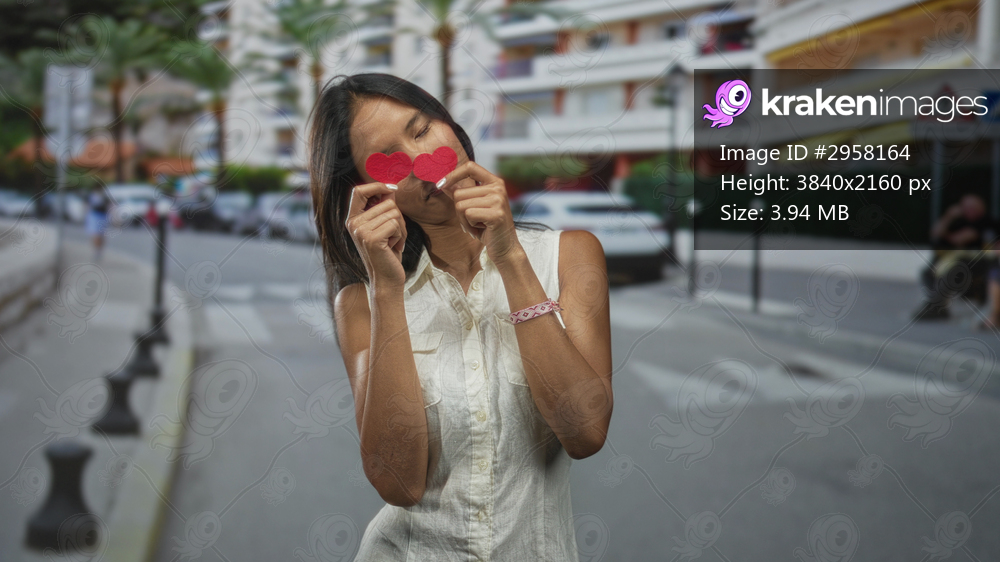 Young thai woman holding a red paper heart with hands over her face on a city street; playful affection.