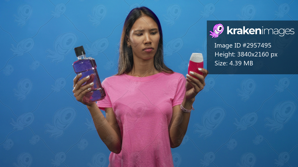 Young thai woman holding mouthwash bottle and toothpaste tube, inspecting and comparing labels with her hand in studio; uncertainty decision.