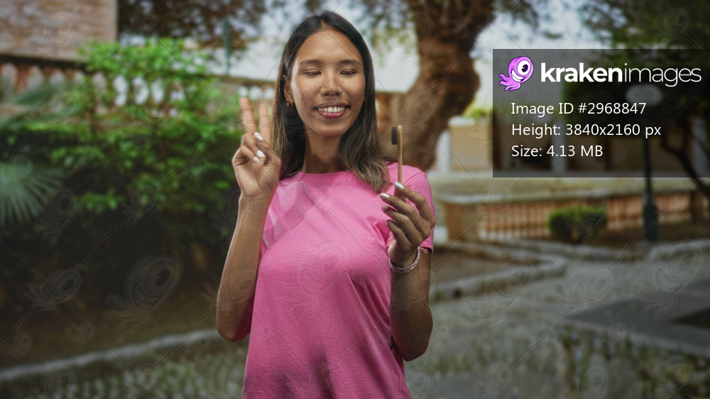 Young thai woman holds bamboo toothbrush and shows peace sign with her hand while smiling in a building courtyard; sustainable oral care joy.
