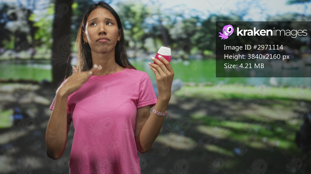 Young thai woman holds pink toothpaste bottle near mouth, hand to face gesture, standing by park pond with trees and sunlight; self care calm.