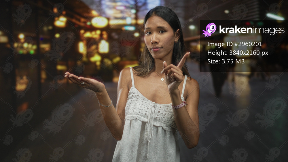 Young thai woman in a white dress points index finger with open palm while standing on a busy night street lined with lights and blurred pedestrians; thoughtful curiosity. - Kraken Images