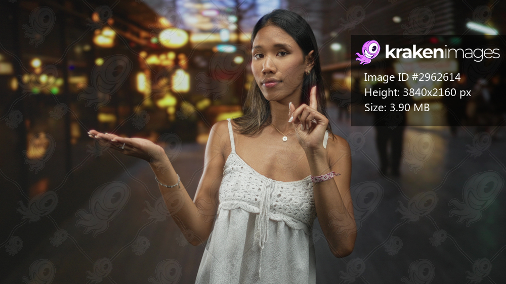 Young thai woman in a white dress points index finger with open palm while standing on a busy night street lined with lights and blurred pedestrians; thoughtful curiosity. - Kraken Images