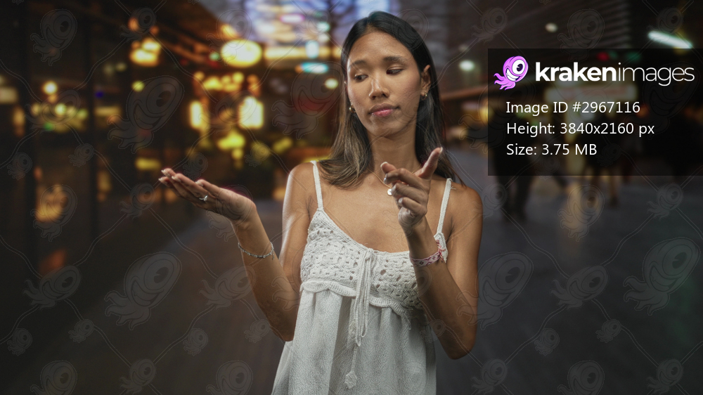 Young thai woman in a white dress points index finger with open palm while standing on a busy night street lined with lights and blurred pedestrians; thoughtful curiosity. - Kraken Images