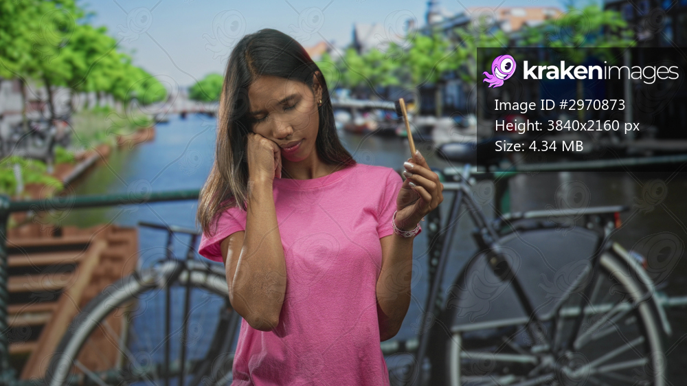 Young thai woman in pink shirt holding a bamboo toothbrush touching cheek for toothache on street canal bridge beside bicycle; contemplation.