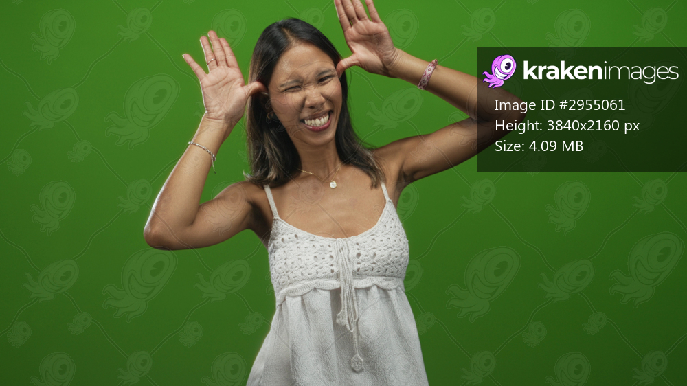 Young thai woman in white dress makes antler gesture with hands and sticks tongue out in green studio; playful mischief.