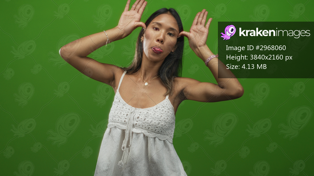 Young thai woman in white dress makes antler gesture with hands and sticks tongue out in green studio; playful mischief.
