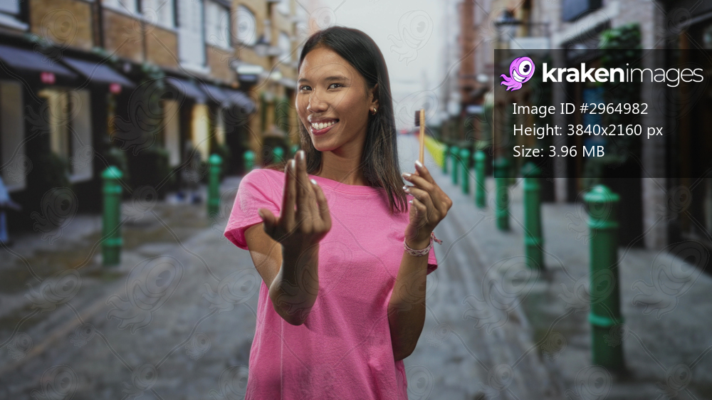 Young thai woman offering a toothbrush with hand extended on a street, smiling and reaching forward; playful cheeky.