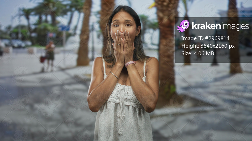 Young thai woman with open mouth and hands near face on a palm lined street; surprise introspection solo.
