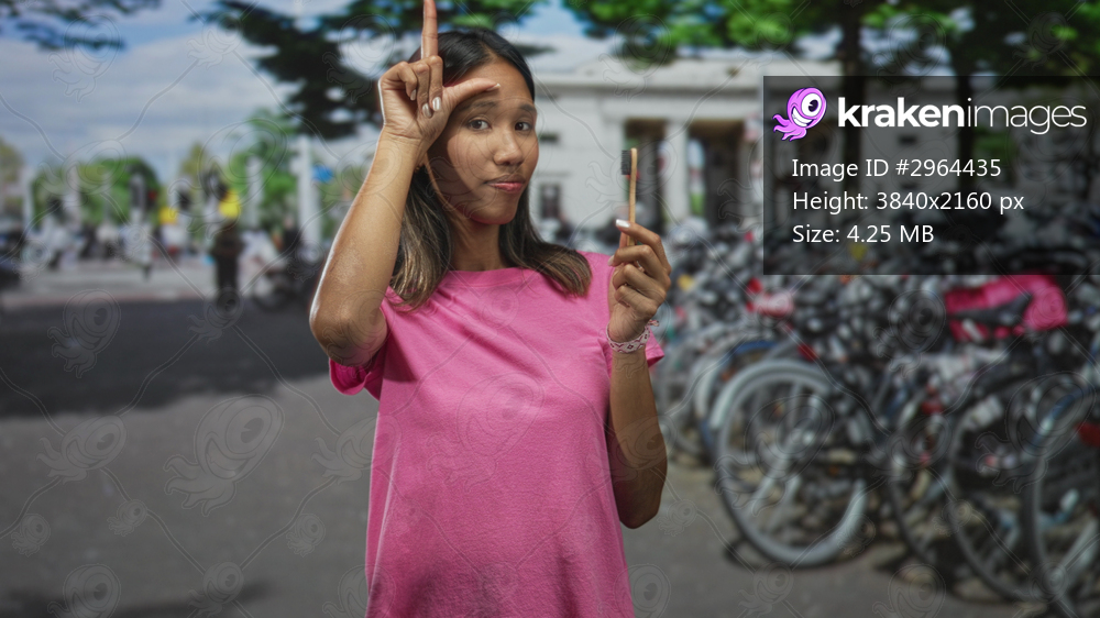 Young thai woman pointing finger and holding toothbrush on street with bicycle racks and building behind; dental care confidence.