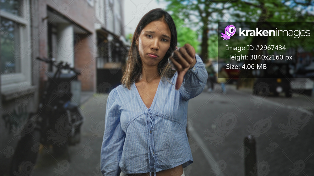 Young thai woman showing thumbs down with visible thumb in a street setting wearing a blue blouse and casual top; disapproval.
