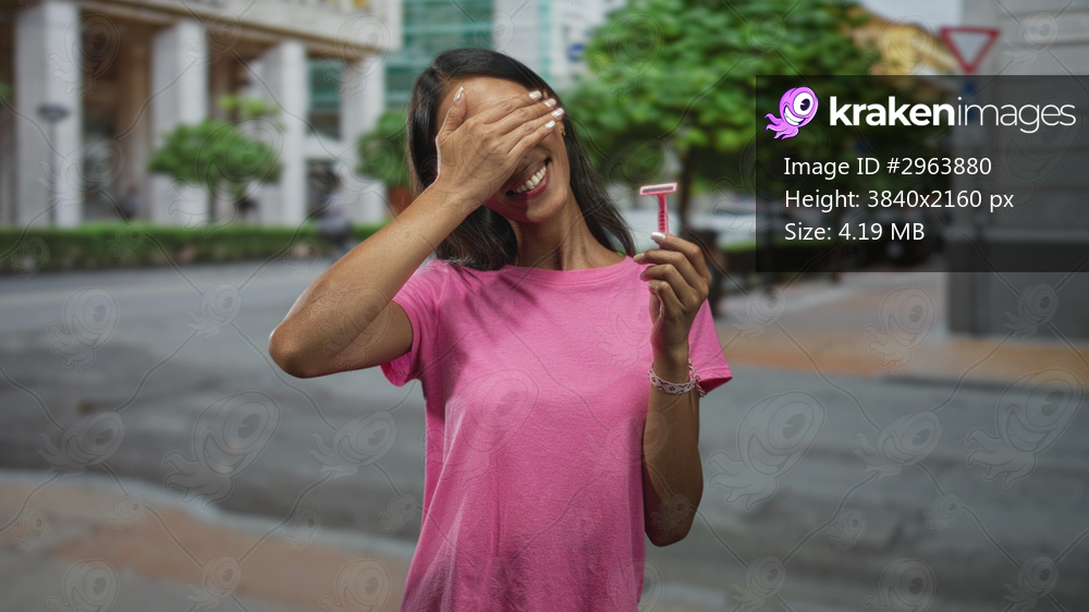 Young thai woman smiling, holding a pink disposable razor and covering her eyes with her hand while standing on a city street; playful self care.