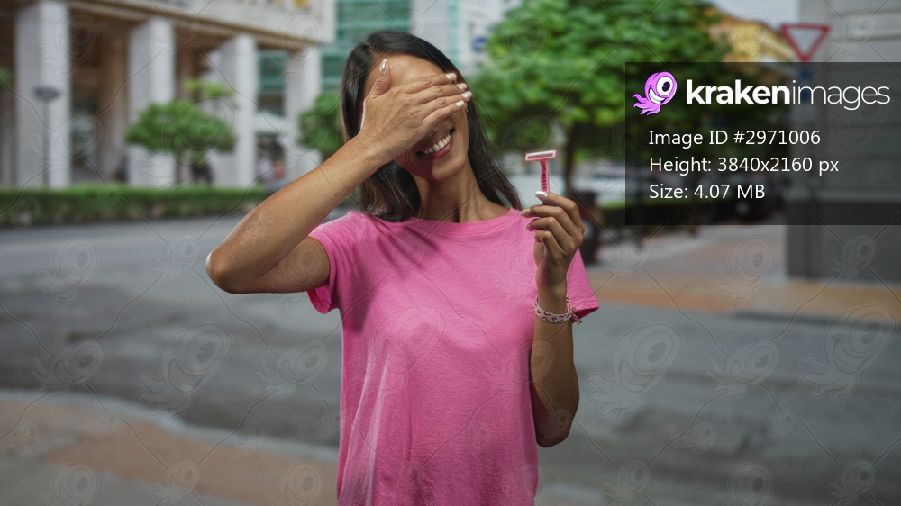 Young thai woman smiling, holding a pink disposable razor and covering her eyes with her hand while standing on a city street; playful self care.