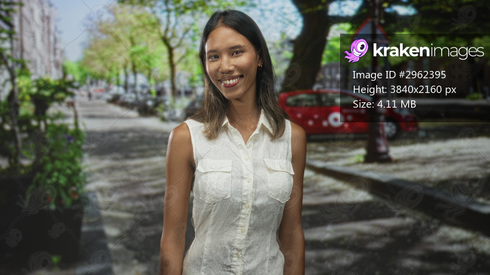 Young thai woman smiling in a white sleeveless shirt on a street with a red car, planter and tree lined pavement in an urban setting; happy casual warmth. - Kraken Images