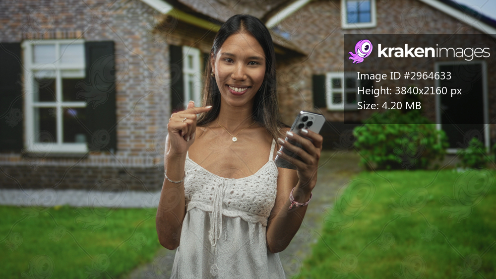 Young thai woman tapping smartphone with finger in front yard of a brick house, smiling in a white sundress; casual connection happiness.