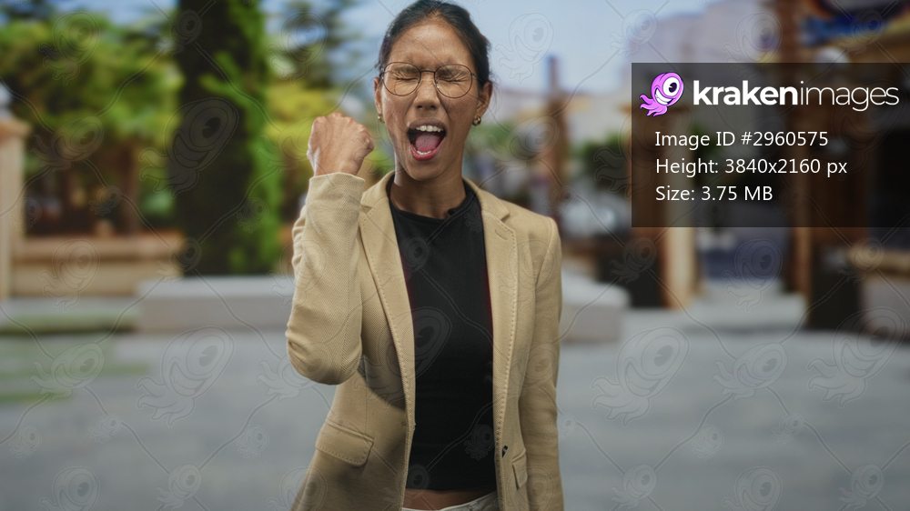 Young thai woman wearing glasses and beige blazer raises a clenched fist and shouts on a city street plaza with columns and trees visible; determination. - Kraken Images