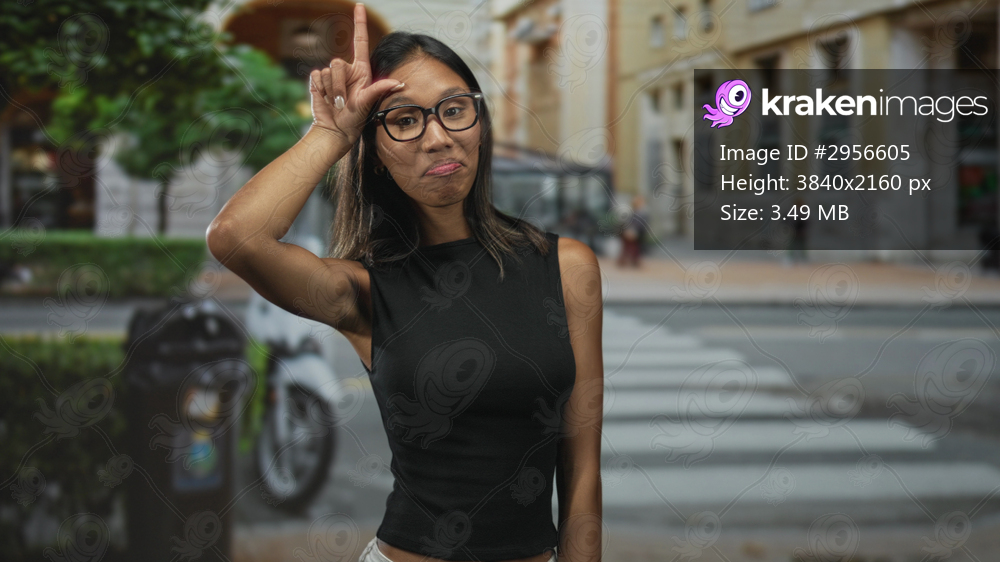 Young thai woman wearing glasses raises a finger and makes an l sign by her forehead while standing at a crosswalk on a city street; playful confidence. - Kraken Images
