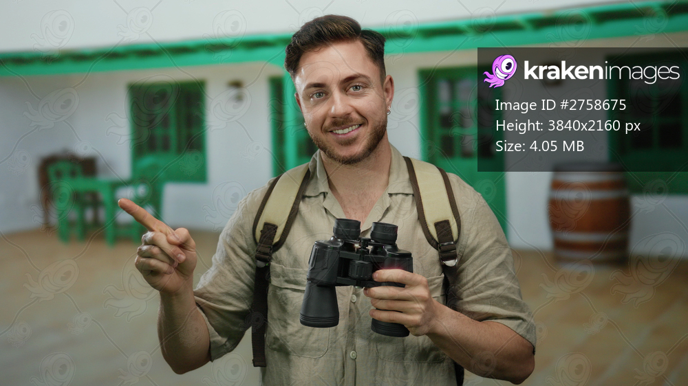 Young tourist man with a beard, holding binoculars and pointing on a city street, wears a backpack, suggesting adventure and exploration.