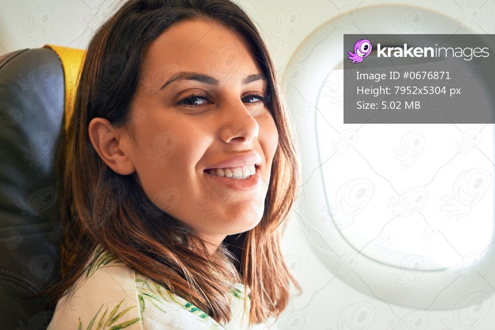 Young traveller woman sitting inside plane at the airport with sky view from the window