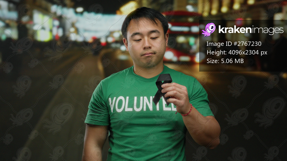 Young volunteer man wearing green shirt holds black ribbon solemnly on a bustling city street at night with blurred lights in background, symbolizing awareness and remembrance. - Kraken Images