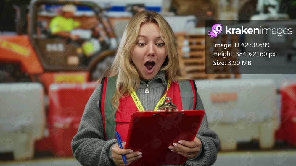 Young volunteer woman with blonde hair and clipboard, surprised at construction site, showcasing shocked expression among outdoor equipment.