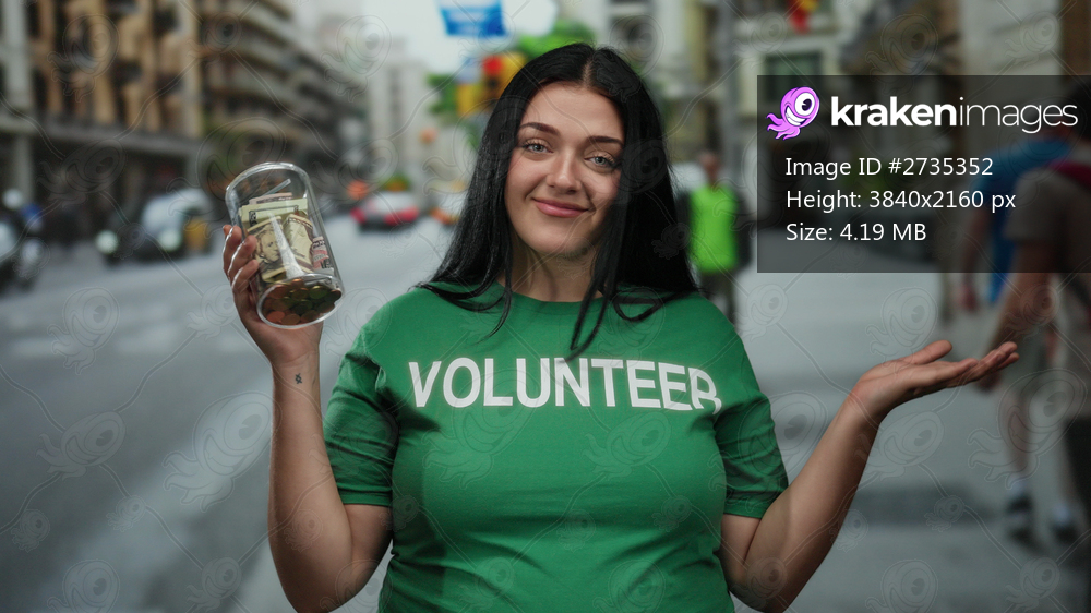 Young volunteer woman holding jar of united states dollars smiles on a bustling city street outdoors, emphasizing charity and community spirit.