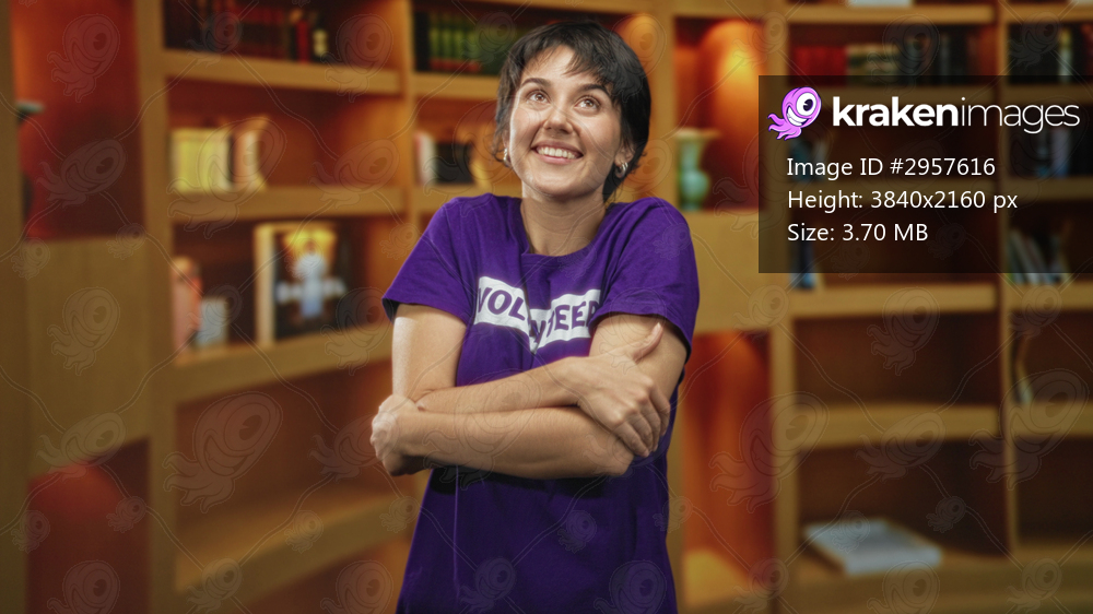Young volunteer woman hugging crossed arms in a bookshelf lined building wearing a purple tshirt; compassion community contentment.
