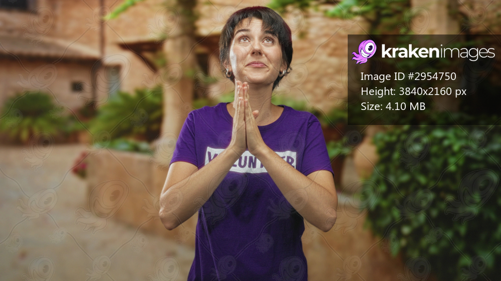Young volunteer woman in a purple volunteer t shirt presses palms together in a joyful prayer gesture on a sunlit stone street; hopeful gratitude.