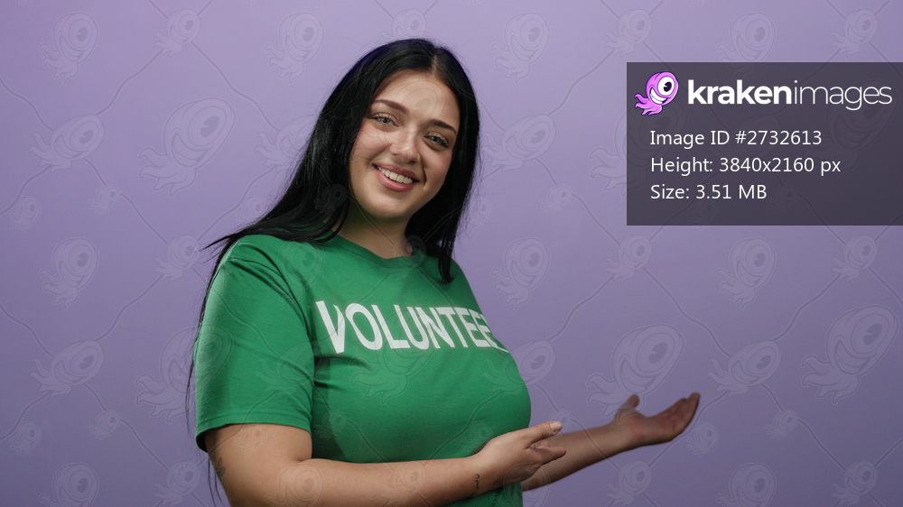 Young volunteer woman in green shirt presenting with hands against a purple wall background, showcasing a welcoming and friendly atmosphere.