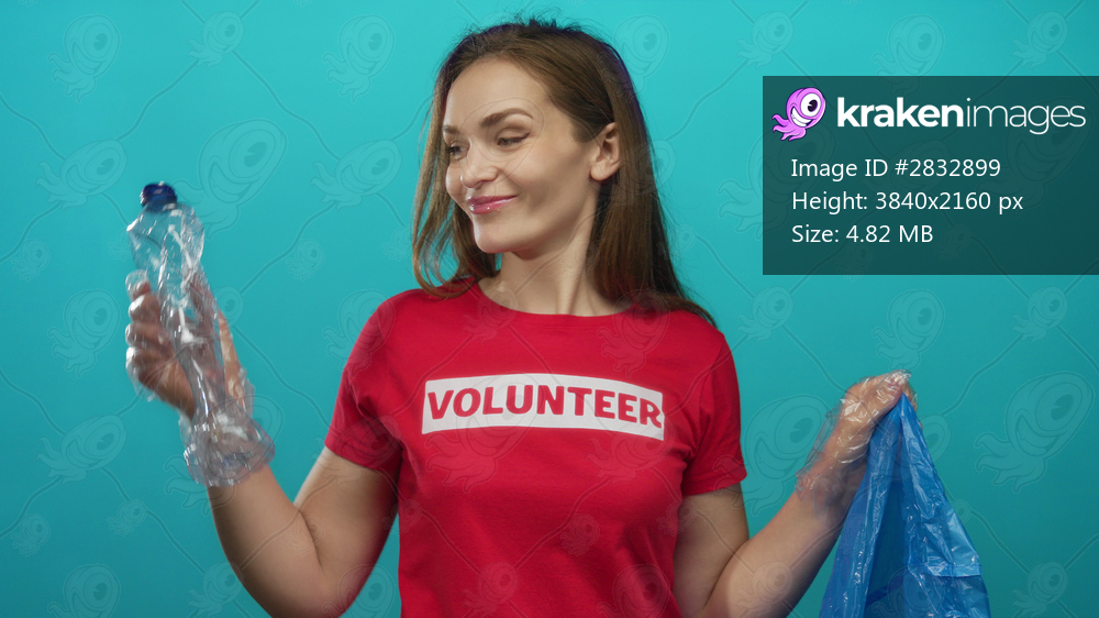 Young volunteer woman lifts plastic bottle and blue recycling bag against turquoise studio wall; sustainability activism.