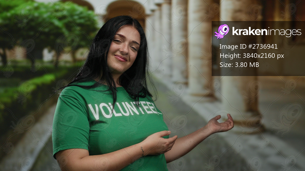 Young volunteer woman presenting in an outdoor urban setting, wearing a green shirt, exuding confidence and friendliness, with historic city architecture in the background. - Kraken Images