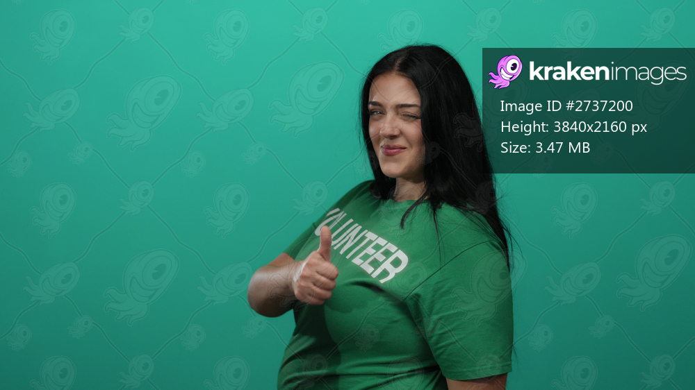 Young volunteer woman smiling giving thumbs up isolated against vibrant green background wall showcasing positive attitude and community involvement.