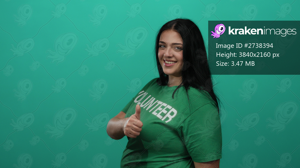 Young volunteer woman smiling giving thumbs up isolated against vibrant green background wall showcasing positive attitude and community involvement.