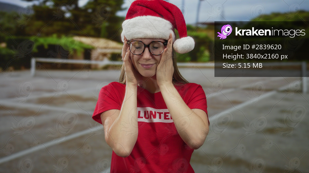 Young volunteer woman wearing glasses and santa hat touches face and smiles on tennis court outdoors; serenity.