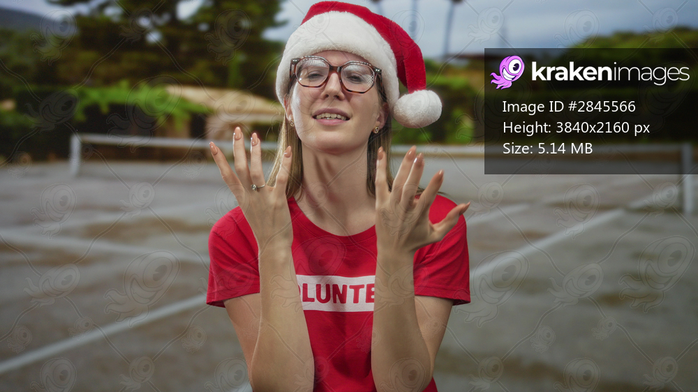 Young volunteer woman wearing glasses and santa hat touches face and smiles on tennis court outdoors; serenity.