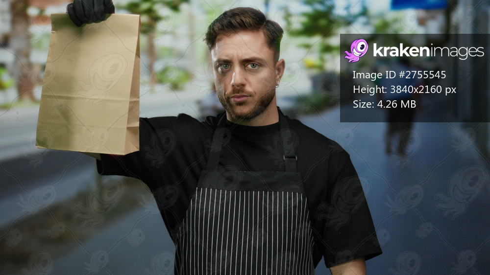 Young waiter wearing gloves holds a takeaway paper bag on a city street blending professionalism and urban vibrancy.