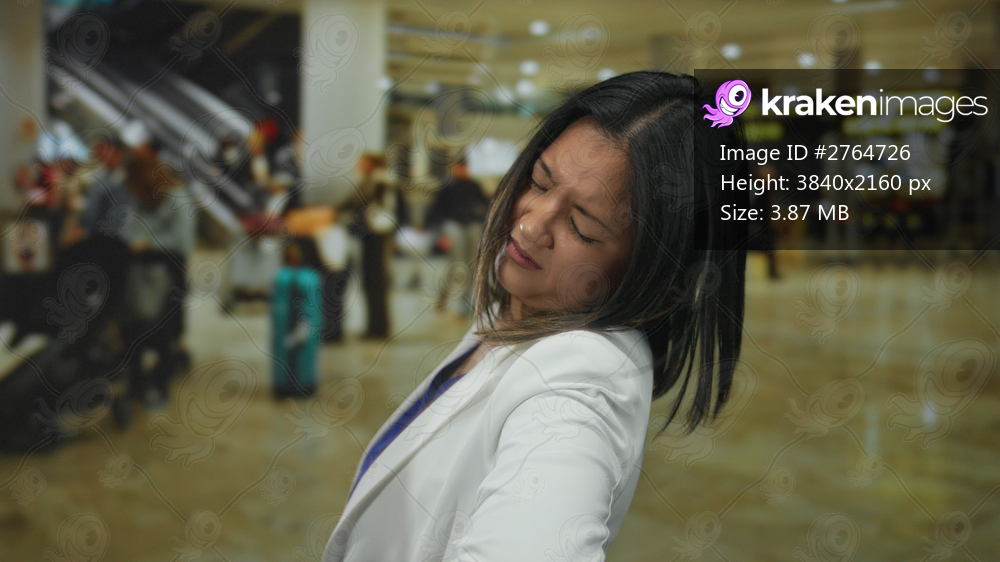 Young woman with a back pain expression at a bustling airport terminal surrounded by travelers, depicting discomfort amid a busy journey setting.