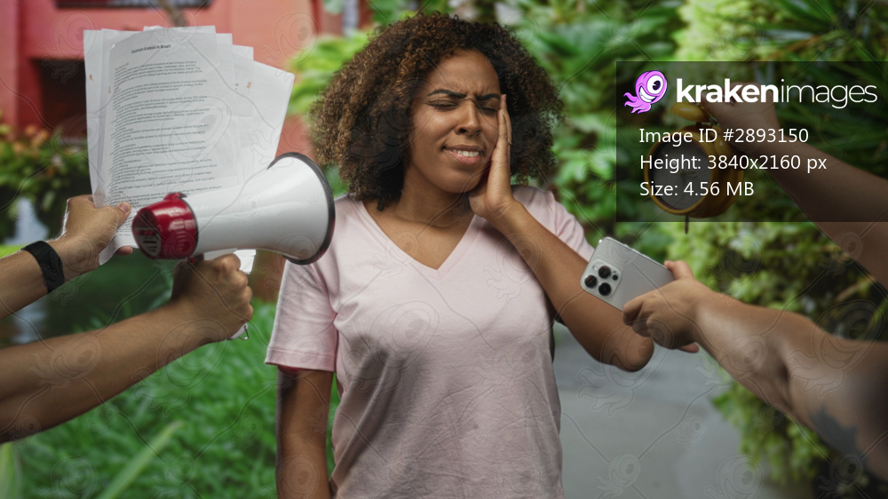 Young woman with a megaphone, papers, phone and alarm clock held near her while covering ears with hands on a street; stress.