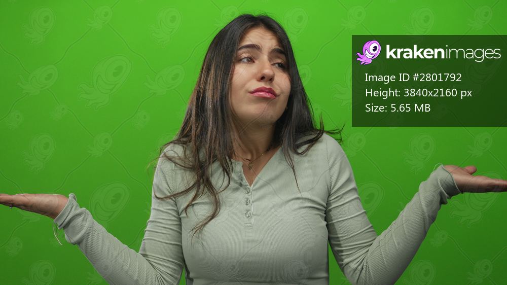 Young woman with a puzzled expression shrugs against an isolated vibrant green wall background implying confusion or questioning.