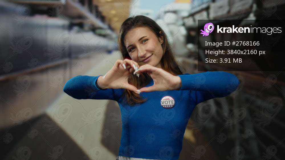 Young woman with a vote badge forms a heart shape with her hands on a cruise boat deck, symbolizing patriotism during a sunny day at sea.