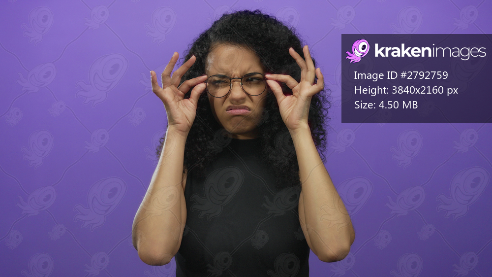Young woman adjusting glasses with a confused expression against an isolated purple background showcasing her curly hair and black shirt