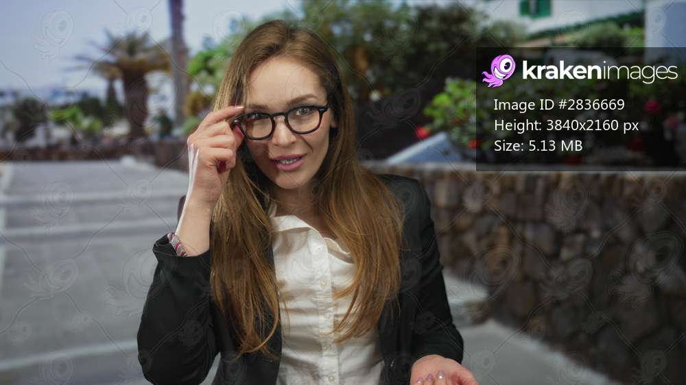 Young woman adjusting glasses with right hand on urban street walkway near stone wall and plants; confusion.