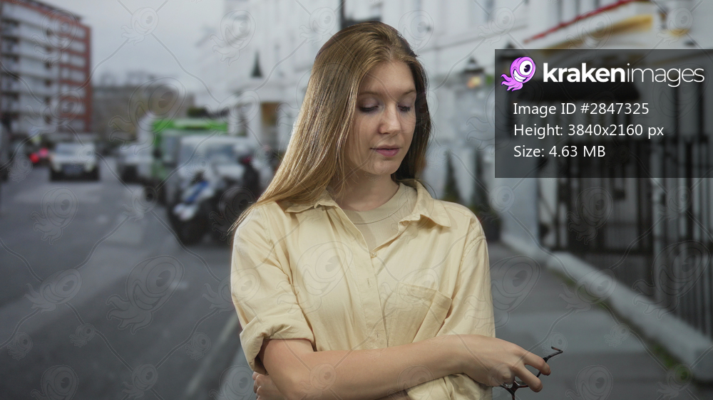 Young woman adjusts sunglasses on busy city street amid passing cars with focused expression; urban reflection.
