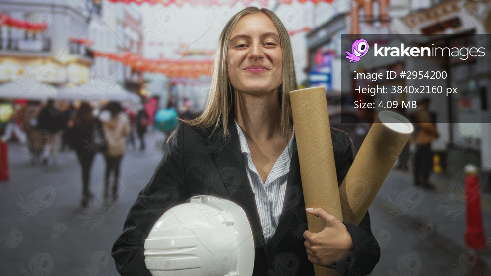 Young woman architect holding white hardhat and rolled plans on a crowded street market; determination ambition.