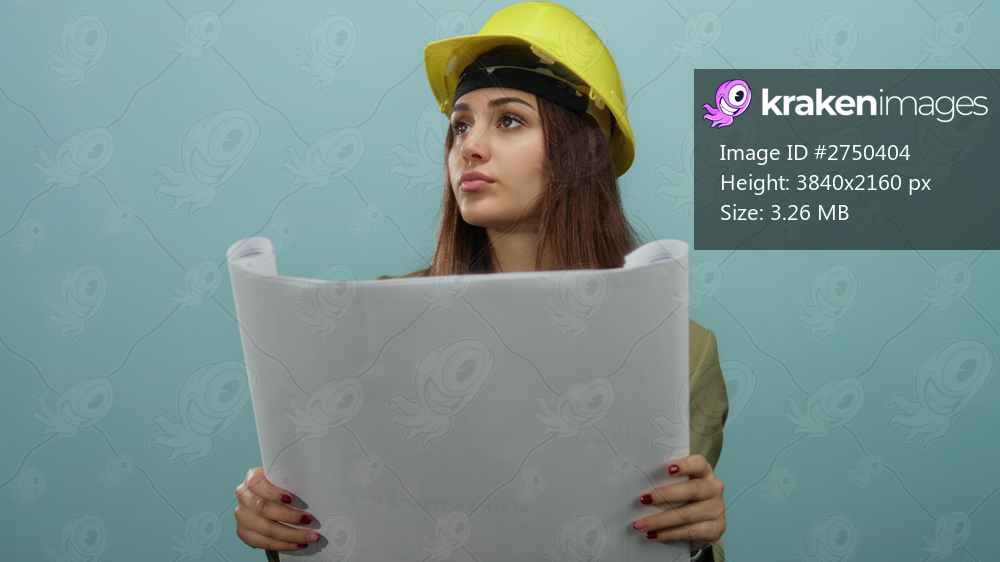 Young woman architect wearing hardhat reviews blueprints isolated against a white background wall, representing professional engineering focus and concentration. - Kraken Images
