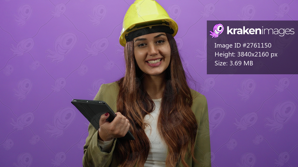 Young woman architect wearing yellow helmet smiles holding tablet against isolated purple background showcasing modern professional career